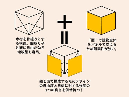 従来の軸組み工法に、体力面材と剛性パネルを組み合わせることにより頑丈な構造を実現。木造軸組工法の良さをそのままに、外周面にパネルを貼り「点と線と面」で建物を支え、高い耐久性と設計の自由度を両立させています。